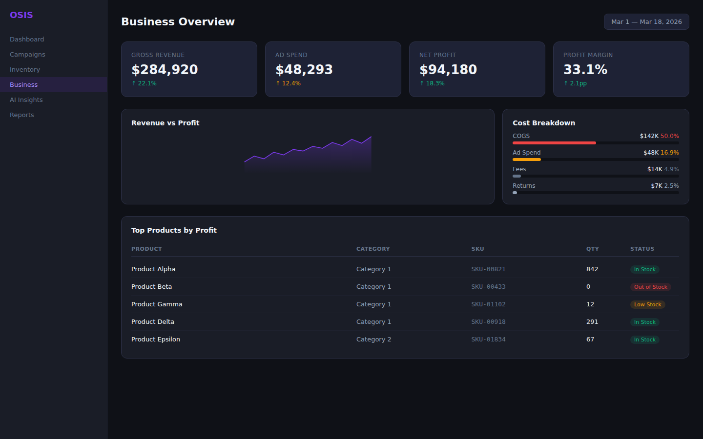 Imagine opening one dashboard tomorrow morning and seeing your real profit — not revenue, not ACOS — your actual take-home across every product, every campaign, every marketplace. That's your first day with Osis.